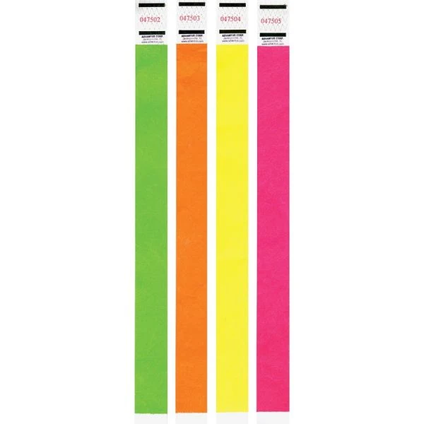 Advantus Crowd Management Wristbands, Sequentially Numbered, 9.75″ x 0.75″, Neon Yellow,500/Pack – Tyvek® wristbands are a simple, colorful and effective way to identify guests. They can be used in a variety of ways, including admission control, designation of special privileges or wherever visual labels are required. They are sequentially numbered and feature an adhesive closure.