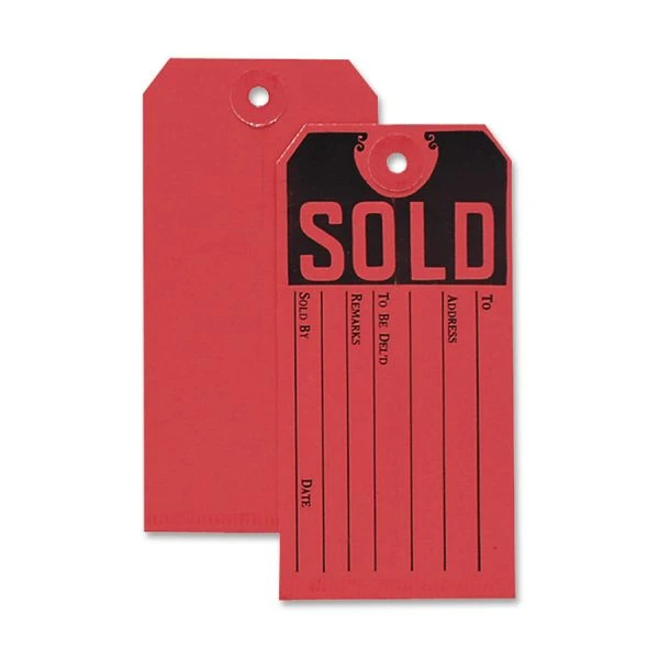 Avery Sold Tags, Paper, 4.75 x 2.38, Red/Black, 500/Box – Update the status of your items for sale quickly with these easy-to-use Sold Tags. Each tag is printed with black ink on eye-catching red cardstock so shoppers will immediately recognize which items are off the market. Preprinted lines let you fill out buyer, seller and delivery information for easy reference. Enjoy the ease of the knife-slit design, or thread a fastener through the tag’s reinforced hole. You’ll be sold on the convenience. Size: 4 3/4 x 2 3/8; Color(s): Red/Black; Depicted Text: “SOLD” with Identifying Information; Material(s): Paper Stock.