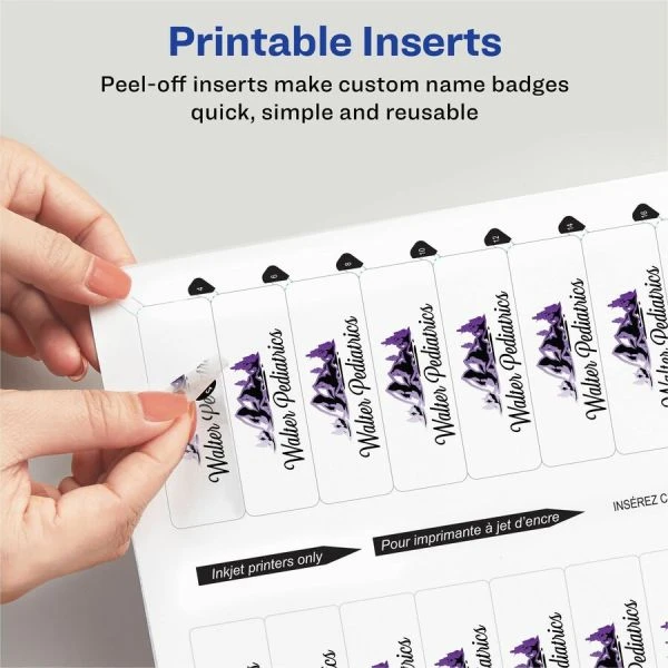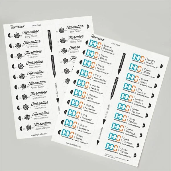 - Quickly and easily customize badges with these non-adhesive peel-off inserts sheets and easy-to-use website.