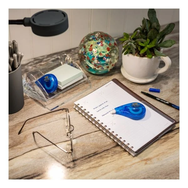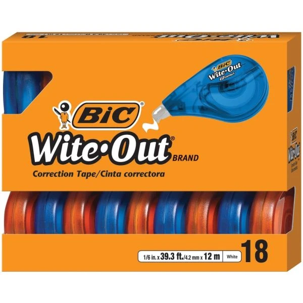 BIC Wite-Out EZ Correct Correction Tape Value Pack, Non-Refillable, Blue/Orange Applicators, 0.17″ x 472″, 18/Pack – Quickly correct typed or handwritten documents with BIC White-Out Brand EZ Correct Correction Tape. This correction tape goes on dry, allowing you to make instant corrections with no mess and no waiting time unlike the correction fluid white out liquid. Dispensing the tape is easy—simply hold the dispenser with your thumb in the groove, position the tip flat on your paper, press down firmly, and gently move from left to right. Offering greater strength than paper-based tape, this film-based correction tape is more tear resistant to create tidy, inconspicuous corrections that last. The self-winding mechanism helps prevent the tape from loosening, so you can apply the tape smoothly and accurately. Thanks to its translucent body, the dispenser lets you see how much tape is remaining.
