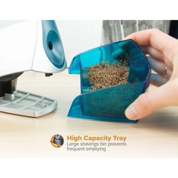 Bostitch Personal Electric Pencil Sharpener, AC-Powered, 4.25 x 8.4 x 4, Blue – Created with the home and office users in mind, its space-saving design fits perfectly in any space and looks great with its modern twist. It may be small, but it has a powerful motor you can rely on to operate stall-free+. The high capacity, easy clean shavings tray will eliminate your frequent trips to the waste basket. And keeping your safety in mind, the shavings tray has the added benefit of safely preventing operation when the tray is removed. Expect precision and clean sharpening with the HHCâ„¢ Cutter Technology, which extends cutter life by 4X*. All completely built for personal convenience.