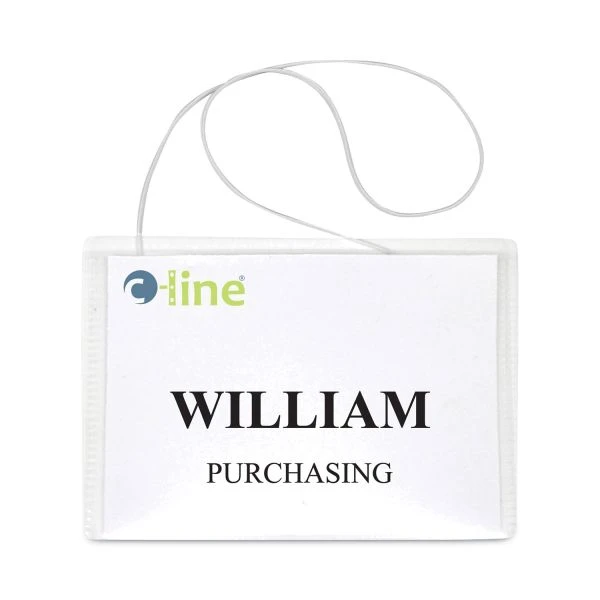 C-Line Name Badge Kits, Top Load, 4 x 3, Clear, Elastic Cord, 50/Box – Garment-friendly badge holders with white elastic cord use no pins, no clips and no adhesives. This vinyl convention-size badge is top-loading and sealed on three sides, making it easy to load and use. Comes with laser/inkjet compatible white microperforated inserts and printer instructions. 8 mil thickness.