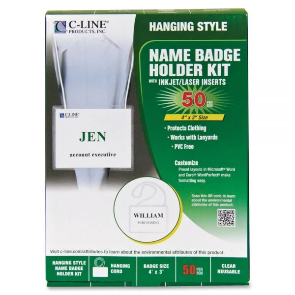 C-Line Specialty Name Badge Holder Kits, 4 x 3, Horizontal Orientation, White, 50/Box – Made from acid-free, archival quality polypropylene which contains an additional additive that allows it to biodegrade when tested according to the ASTM-D5511. Kit includes reusable holders, hanging cords, white inserts and printer instructions.