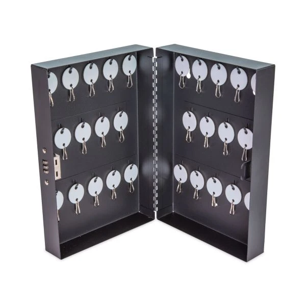 Combination Lockable Key Cabinet, 28-Key, Metal, Black, 7.75 x 3.25 x 11.5 – Strong and lighweight design allows for key tags to be easily attached to the items. Cabinet can be used to store car keys, locker keys and any other keys that do not have a fob. Keeps keys easily accessible in one location. Keys are kept safe and secure with combination lock on cabinet. Perfect for banks, offices, storage facilities and car keys. Wall mountable.
