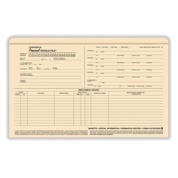 ComplyRight Envelo-File Confidential Personnel Folders, Pack Of 25 – Even though many personnel documents can be stored electronically, you still need original hard copies of forms such as employment applications, warning records and evaluation forms available. The Legal Size CONFIDENTIAL Personnel ENVELO-FILE lets you safely store such employee documents, plus record key employee information and benefits on the outside.