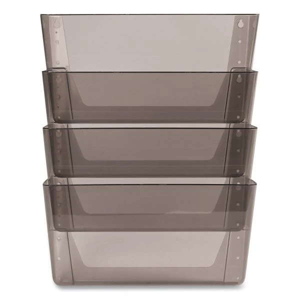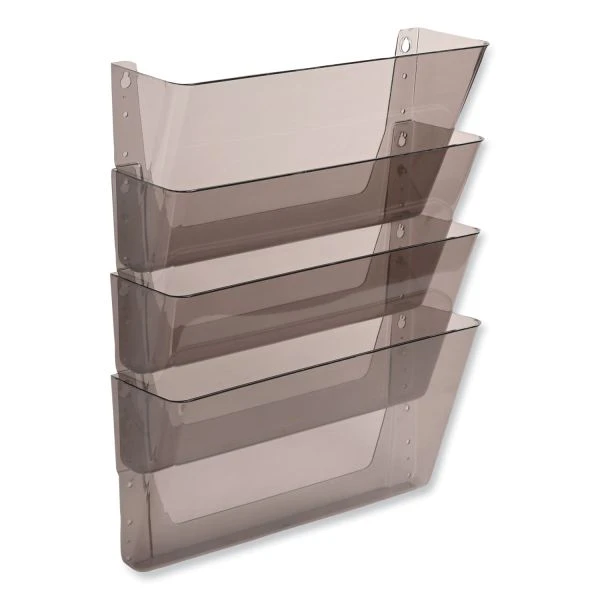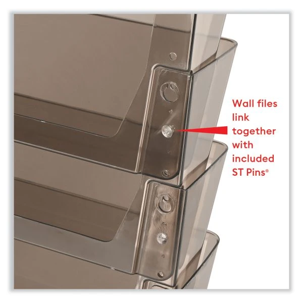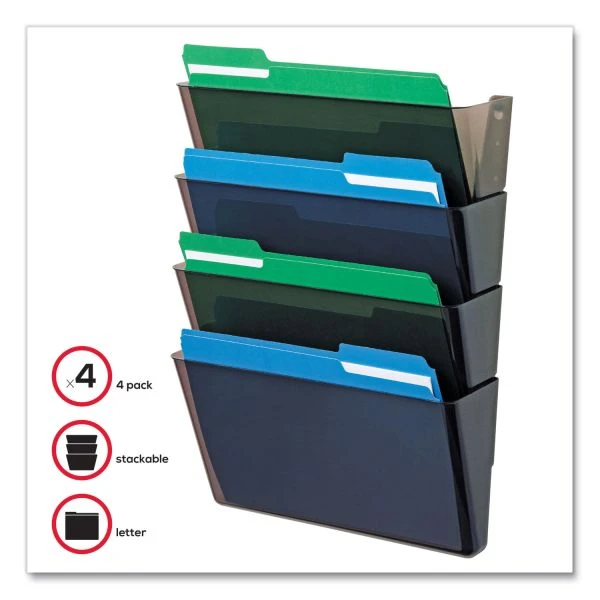 deflecto DocuPocket Stackable Four-Pocket Wall File, 4 Sections, Letter Size, 13″ x 4″, Smoke – An essential tool for every office, this attractive four-pocket wall file moves papers off the desk, creates extra space and organizes your office. Durable construction for long-lasting use. Great for high-traffic areas and large workloads. Stackable units connect easily with the included EZ Link linking pins, minimizing wall damage, and accommodates letter-size documents and files. Its waterfall design provides visibility to many files at one time. Mounting hardware included.