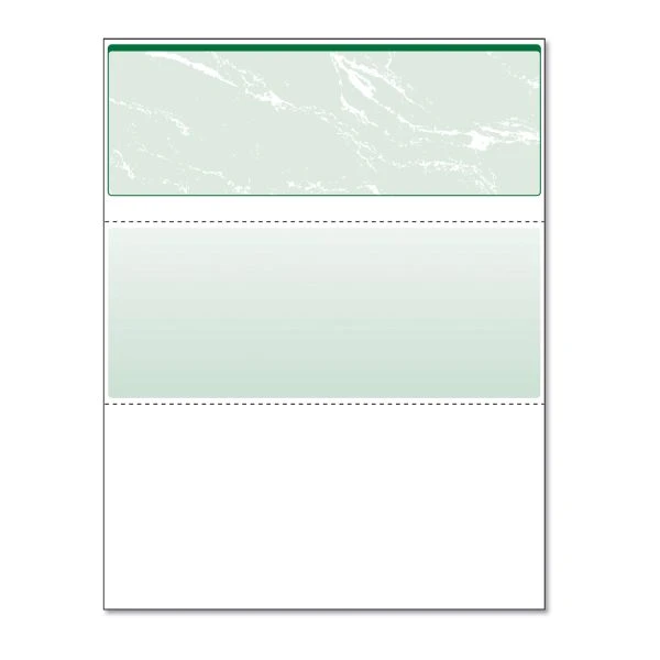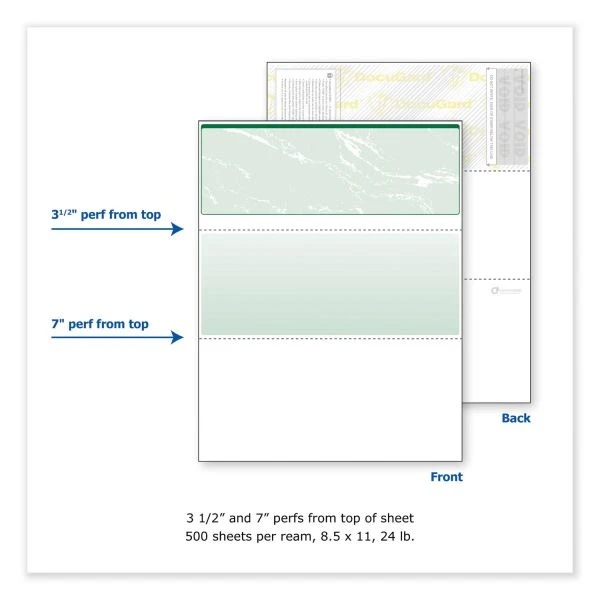 DocuGard Standard Security Check, 8 1/2 x 11, Green Marble Top, 11 Features, 500 Sheets/Ream – These DocuGard Security Business Checks with a marbled pattern incorporate 11 security features recommended by the National Check Fraud Center. Compatible with most money management software programs. Security features include Check-21 compliancy, VOID” pantograph on front and back, erasure-resistant background, security warning, VOID when copied, anti-splice backer, security features listing, watermark, check verification number, coin reactive ink and microtext print. Checks are for use with all laser and inkjet printers.