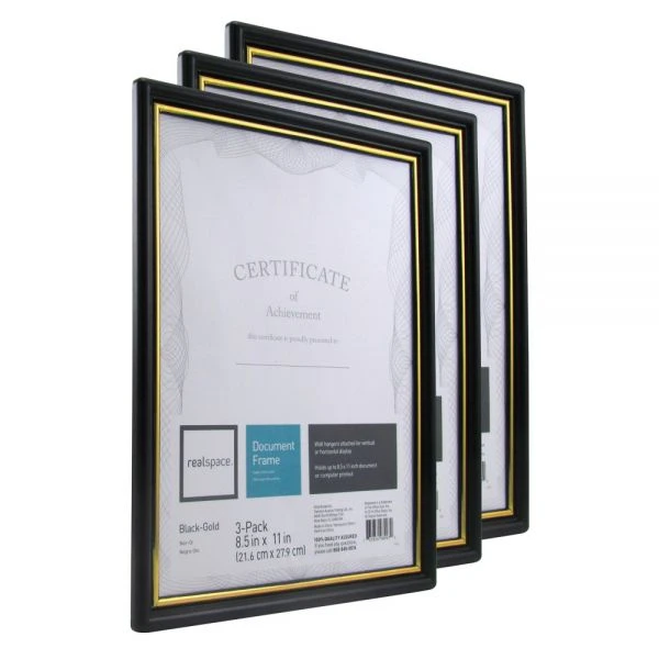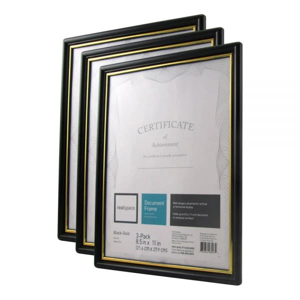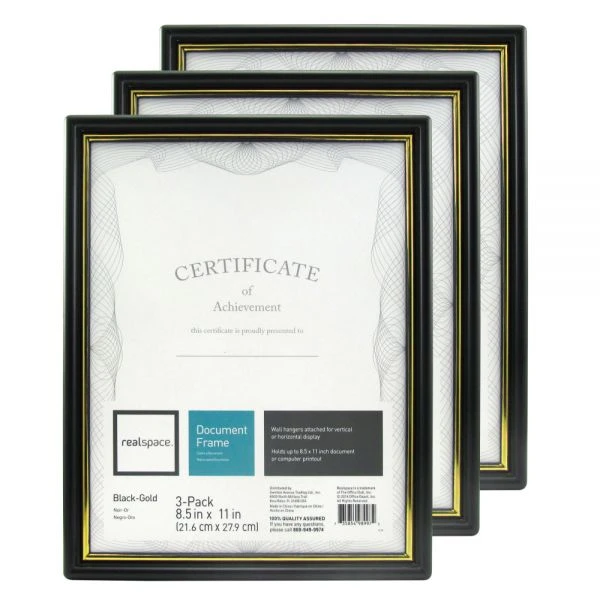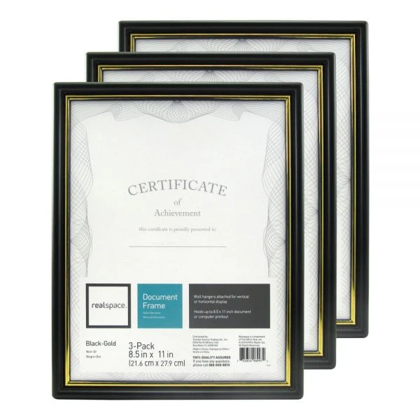Document And Certificate Holders, 8-1/2″ x 11″, Black/Gold, Pack Of 3 Holders – Realspace photo and document frames let you display and protect your prized 8-1/2″ x 11″ documents. This document holder can be hung vertically or horizontally to accommodate the orientation of your certificate, photo or printout.