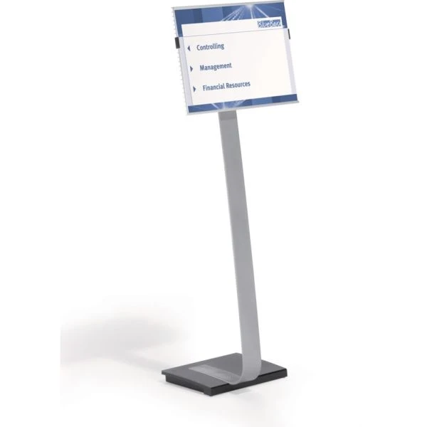 Durable Info Sign Duo Floor Stand, Tabloid-Size Inserts, 15 x 50, Clear – Patented mechanism allows effortless rotation from portrait to landscape orientation. Anti-glare, crystal clear front panel removes in seconds for quick insertion of sheets. High-quality aluminum floor stand has a rugged cast iron base with rubber pads for stability. Can also be used with DURABLE Literature Dispensers (sold separately).