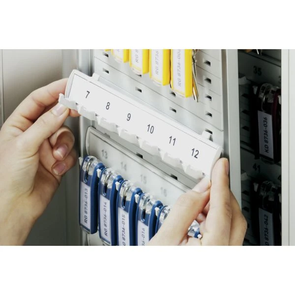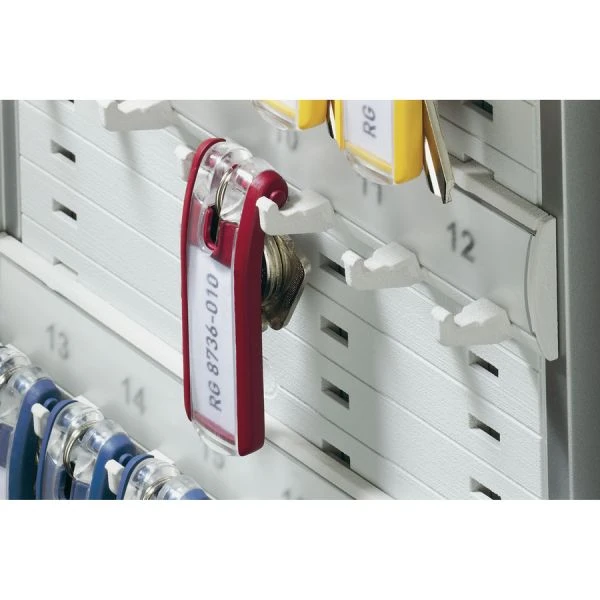 Durable Key Rack, 24-Tag Capacity, Plastic, Gray, 8.38 x 1.38 x 14.13 – Wall-mountable key rack offers an ideal for simple key storage solutions that do not require a cabinet. Individual key rails are height-adjustable to the length of the keys. Key tags have extra-large snap-open label window and patented key-ring shaft. Key tag label can be exchanged without removing key ring. Capacity is 24 key tags. Rack includes a starter set of six key tags, two black, two dark blue, one red, one yellow, wall-mounting hardware and template for wall-mounting.