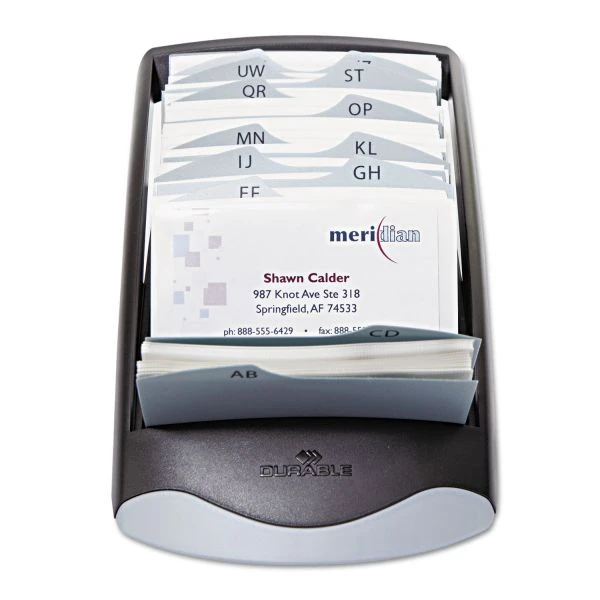 Durable VISIFIX Desk Business Card File, Holds 200 2.88 x 4.13 Cards, 5 x 9.31 x 3.56, Plastic, Graphite/Black – Compact, easy-access card file stores hundreds of business cards. The perfect blend of stylish, sleek design and user-friendly features. Rubber pads prevent slipping and scratching. Includes 100 clear, slotted pockets and 12 A-Z guides.