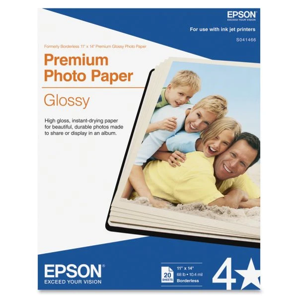 Epson Glossy Photo Paper – Premium Glossy Photo Paper has a high-gloss finish that is perfect for printing your favorite cherished photos and enlargements for glass frames and photo albums. Smudge-resistant and water-resistant bright white, resin-coated stock offers the look and feel of traditional photographs. 68 lb. 10.4 mil thickness.