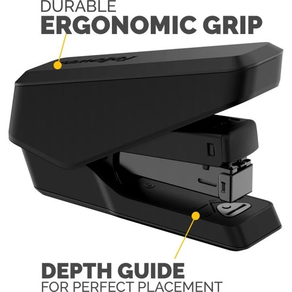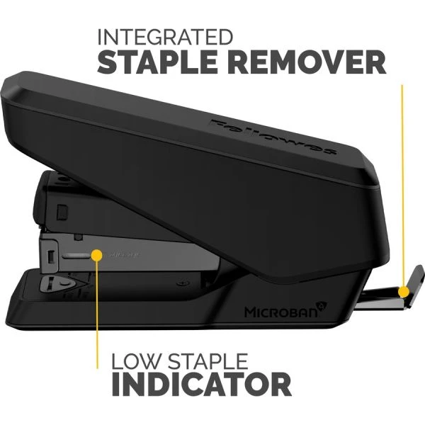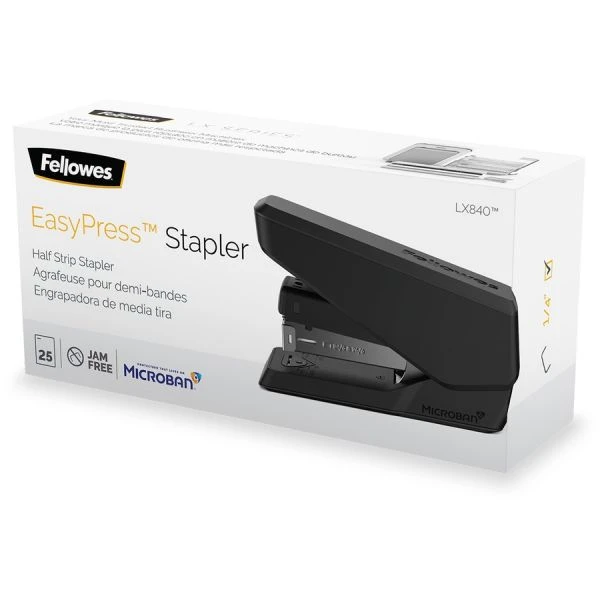 Fellowes LX840 EasyPress Half Strip Stapler, 25-Sheet Capacity, Black – Engineered to be effortless and designed to be seen, the LX Series staplers were built with quality, durability, and function in mind. Constructed with premium materials and offering jam-free performance, the LX Series staplers ensures successful stapling every time. The Fellowes LX840 EasyPress Half Strip Stapler features Microban antimicrobial technology for an added level of product protection and EasyPress technology that offers easy jam-free stapling of up to 25 pages. Works best with 0.25″ staples. Experience its ergonomic design for comfortable stapling.