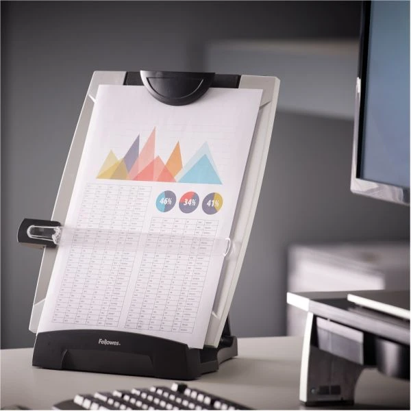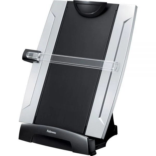 Fellowes Office Suites Desktop Copyholder with Memo Board, 150 Sheet Capacity, Plastic, Black/Silver – Desktop Copyholder places documents at eye-level to help prevent neck strain and improve your efficiency. Design functions as a document holder, memo board and clipboard, adjusts easily for A4/letter/legal paper. Holds up to 150 sheets at a time. Adjustable tilt customizes your viewing angle by up to 45 degrees. Movable line guide slides up or down and swings out of the way when not in use. Dry-erase memo board is ideal for quick reference notes or reminders. Slide out and turn over copyholder backing to use the memo board feature. Desktop copyholder with erasable memo board matches the rest of Fellowes Office Suite Desk Accessories with smart styling in contemporary black and silver for the professional work space.