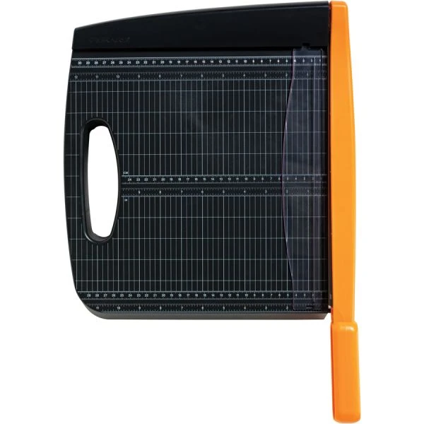 Fiskars Bypass Paper Trimmer – The Bypass Paper Trimmer with a 12″ cut length features an easy-to-use blade for consistently straight and clean cuts. Ergonomic handle provides a comfortable, secure grip for safe handling. Paper clamp is made with a smudge guard to hold your papers or photos in place without getting fingerprints on your items. Safety lock and built-in carrying handle provide a safe, convenient way to transport the trimmer from room to room. Gridlines on the deck provide a helpful guide when cutting for precise measurements.