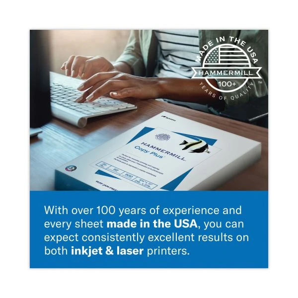 Hammermill Copy Plus Copy Paper, 92 Brightness, 20 lb, 8 1/2 x 14, White, 5000 Sheets/Carton – Copy Plus printer paper is an economical paper designed for everyday use at offices large and small. Offering dependable performance on all office machines, you’ll want to have plenty of this dependable paper on hand for everyday, general office use. It works well in high-speed copiers, dry toner plain-paper copiers and fax machines. ColorLok® for bolder blacks, brighter colors and faster drying. Backed by the 99.99% Jam-Free® Guarantee. Acid-free material prevents yellowing over time to ensure a long-lasting appearance. This product was made from wood sourced from a certified managed forest.