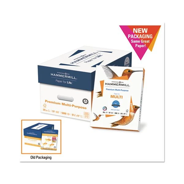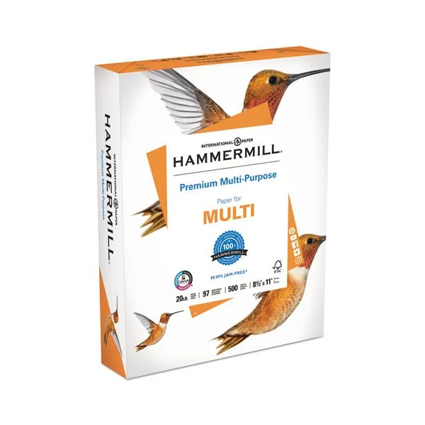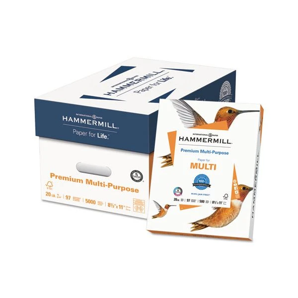 Hammermill Premium Multipurpose Paper, 97 Brightness, 20 lb, 8 1/2 x 11, White, 5000 Sheets/Carton – Premium multipurpose printer paper provides a versatile sheet that’s designed to run effectively through all office equipment. High brightness and heavy basis weight combine to produce high-quality documents with sharp, clear images. ColorLok® technology for vivid colors, bolder blacks and faster drying time. Ideal for duplex copies, newsletters, flyers, forms, reports, price listings, manuals and more. Backed by the 99.99% Jam-Free® Guarantee. Acid-free material prevents yellowing over time to ensure a long-lasting appearance. This product was made from wood sourced from a certified managed forest.