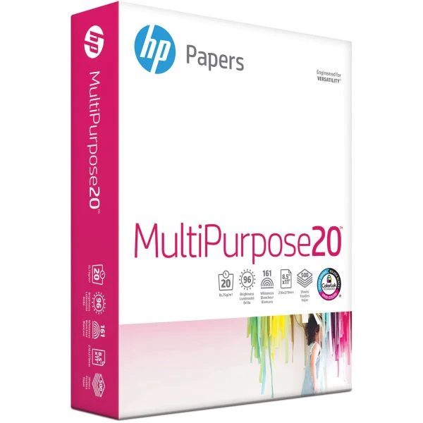 HP Multipurpose Paper, 96 Brightness, 20 lb, 8 1/2 x 11, White, 5000 Sheets/Carton – Engineered for versatility, Multipurpose20 printer paper offers the level of quality and variety you need to support a wide range of everyday color printing needs. Heavier and thicker than regular multipurpose paper, you can print on both sides with minimal show-through. Ideal for reports, correspondence and everyday color documents. Optimized for use in all inkjet and laser printers and copiers. Acid-free for archival quality.