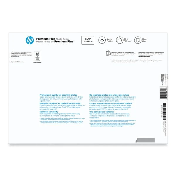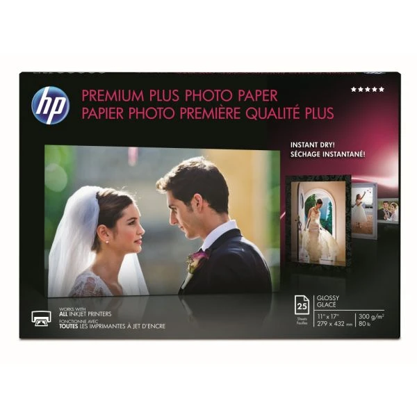 HP Premium Plus Photo Paper, 11.5 mil, 11 x 17, Glossy White, 25/Pack – Premium Plus Photo Paper delivers professional-quality photos with Hewlett-Packard Vivera inks that resist fading for generations. Smooth gloss finish, sturdy thickness and weight rival professional photographs. Professional-quality sheets maximize color intensity. Unique HP back-coating prevents prints from sticking when stacked. Ideal for family and important event photos.