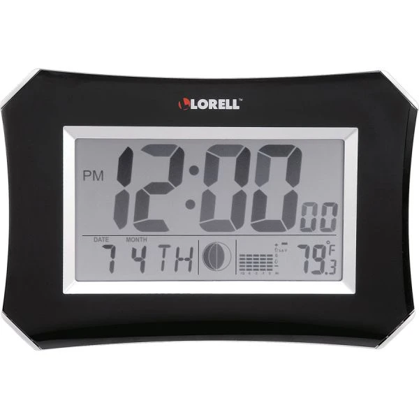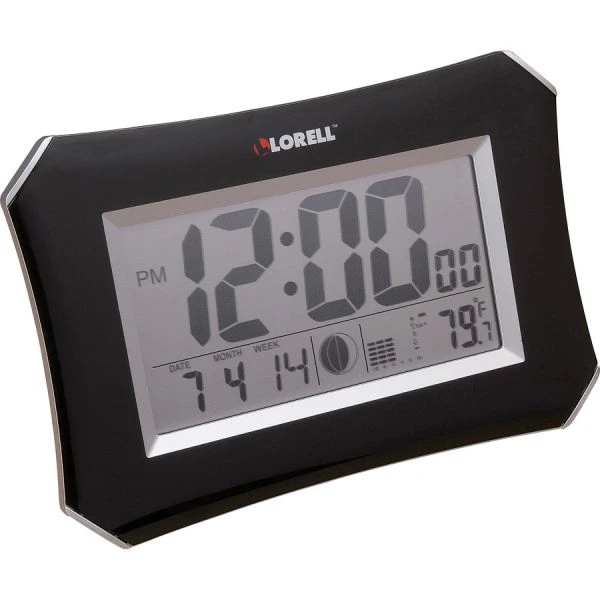 Lorell LCD Wall/Alarm Clock – Large LCD wall clock shows more than just the time. The alarm clock also features a temperature display in your choice of Fahrenheit or Celsius, a bar chart to show the temperature history for the last 12 hours, the moon phase, and week of the year. The alarm function works weekdays and weekends and offers a snooze feature. Silver casing is made of ABS casing for durability. The face is printed with black numerals. The hour and minute hands are also black. Lens is made of plastic.