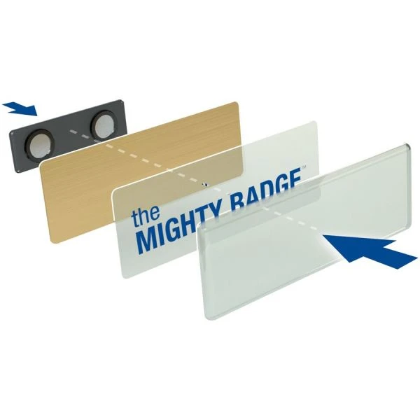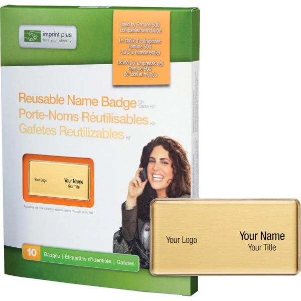 Mighty Badge Reusable Magnetic Name Badge System – Gold badges are part of the Imprint Plus Mighty Badge Reusable Name Badge System that offers a quick, easy way to create and customize reusable name badges. Each versatile badge features a rectangular metal plate; elegant domed lens cover; and extra-strong, magnet fastener to secure the badge in place even during the most hectic days. Fasteners affix your name badges even through the thickest fabrics, including knits, sport jackets, and even winter outerwear. To personalize each badge, apply a printable transparency (sold separately) that you can replace again and again. Set includes 100 metal plates (1-1/2 x 3″), 100 lens covers and 100 magnet fasteners.”