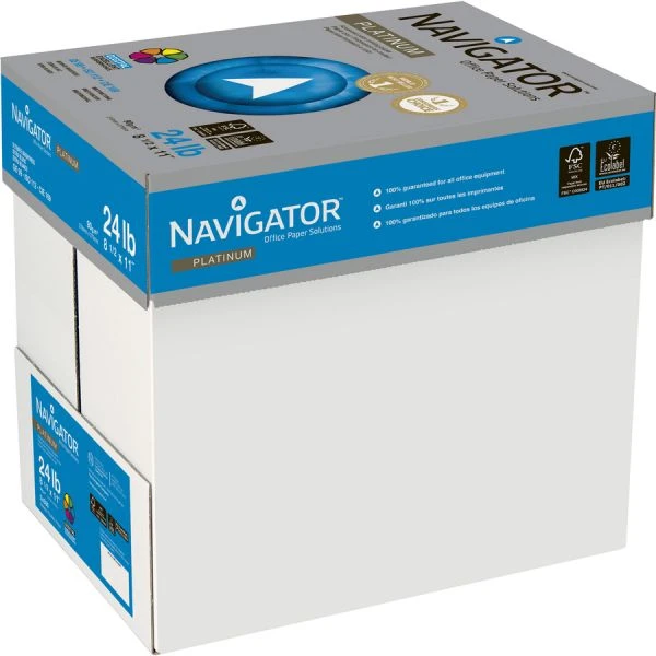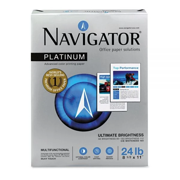 Navigator Platinum Paper, 99 Brightness, 24 lb, 8 1/2 x 11, White, 2500 Sheets/Carton – Color printing paper features an enhanced surface with a smooth finish. Compatible with laser and inkjet printers, multifunction printers, fax machines and copiers. 24 lb. paper delivers a crisp image with optimal color contrast and jam-free operation.