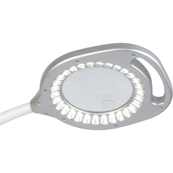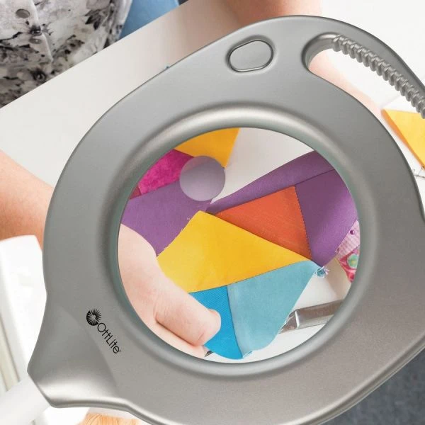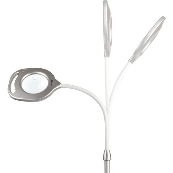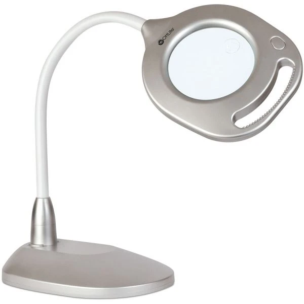 OttLite LED Magnifier Floor & Table Light – Enjoy high-quality, ClearSun illumination with optical-grade magnification in your choice of a floor or table lamp. The 2-in-1 LED Magnifier Floor and Table Light includes a conversion kit that lets you easily change it from floor to table lamp and back again. With OttLite’s ClearSun LEDs up to 240 lumens, you’ll see fine details clearly with reduced glare and eyestrain. This powerful magnifying lamp features a 2x optical-grade magnifier (5″) surrounded by ClearSun LEDs, a spot 4x magnifier, rugged flexible neck and integrated handle to place the lamp exactly where you need it. Maximum Super Bright Natural Daylight LEDs are rated to last up to 40,000 hours. Height adjusts from 39-1/2″ (table) to 54-3/4″ (floor). Base measures 15-5/8″ x 7-1/8″.