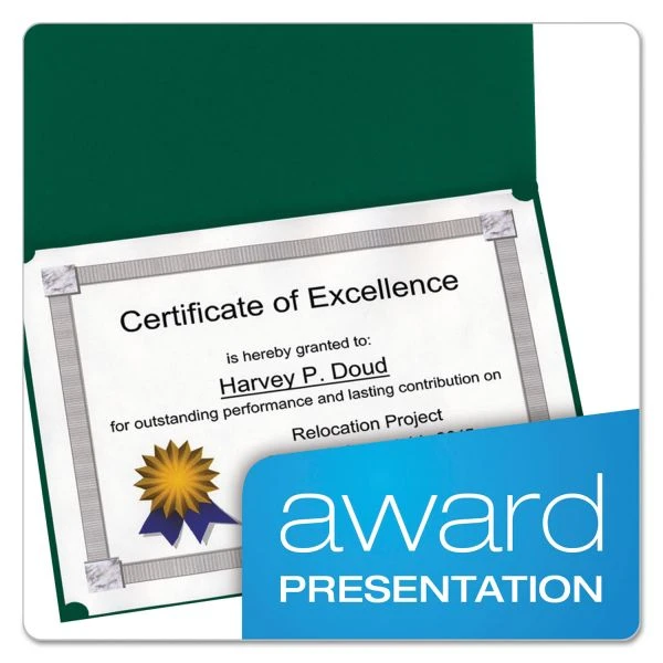 Oxford Certificate Holder, 11.25 x 8.75, Green, 5/Pack – Certificate holders feature linen-finish texture on heavy stock with gold accents. Use for vertical or horizontal certificates. Unique, reinforced slots securely hold corners of 11 x 8-1/2″ certificates. Holders are made of acid-free material.