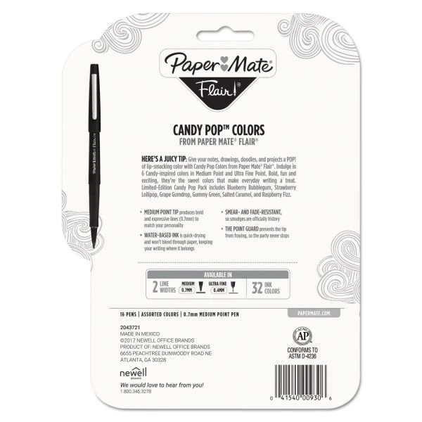 Paper Mate Flair Candy Pop Pack Felt Tip Pens – Felt tip pen with a medium point delivers a smooth laydown and produces crisp lines to let you express yourself with true style and color. Smear-resistant, water-based ink dries quickly and will not bleed through paper for legible handwriting. Slide the cap conveniently on top of the pen during use to ensure you never lose it when writing. Point guard prevents the tip from fraying for lasting use. Medium point creates bold and expressive lines. Handy clip attaches to pockets, notebooks and more for easy access and storage. Felt tip pen is perfect for everyday use at home, office and school.
