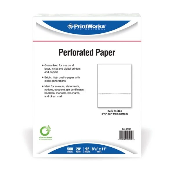 PrintWorks Professional Professional Office Paper, 20 lb, 8 1/2 x 11, Perforated 3 2/3″ from Bottom, White, 500 Sheets/Ream – Ideal for a variety of business, medical, legal and educational applications. Provides optimum results with any laser printer or copier.