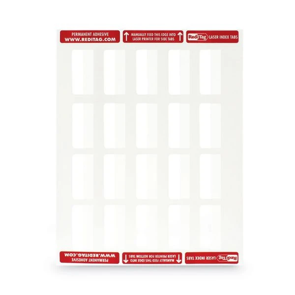 Redi-Tag Laser Printable Index Tabs, 1/5-Cut, White, 2″ Wide, 300/Pack – Printable index tabs allow you to create professional quality indexes without the expense of custom index sets. Tabs have self-stick permanent adhesive and attach to side or bottom of any size page or divider sheet for maximum flexibility. Design your own with templates in Microsoft Word or WordPerfect to produce a finished, professional look. Tab sheets are compatible with laser and inkjet printers. Tabs are made from heavy-duty, durable plastic that won’t tear or curl. Index tab kit includes templates and instructions.