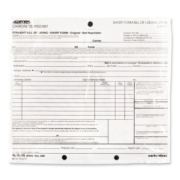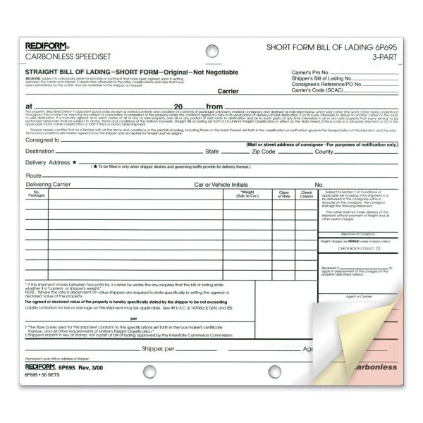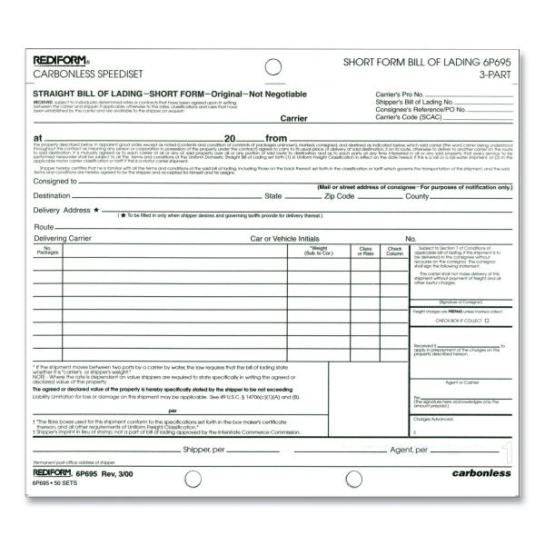 Rediform Speediset Bill of Lading, Short Form, Three-Part Carbonless, 7 x 8.5, 50 Forms Total – Perfect for when eight or fewer entries are needed. Provides accurate contractual wording for complete documentation.