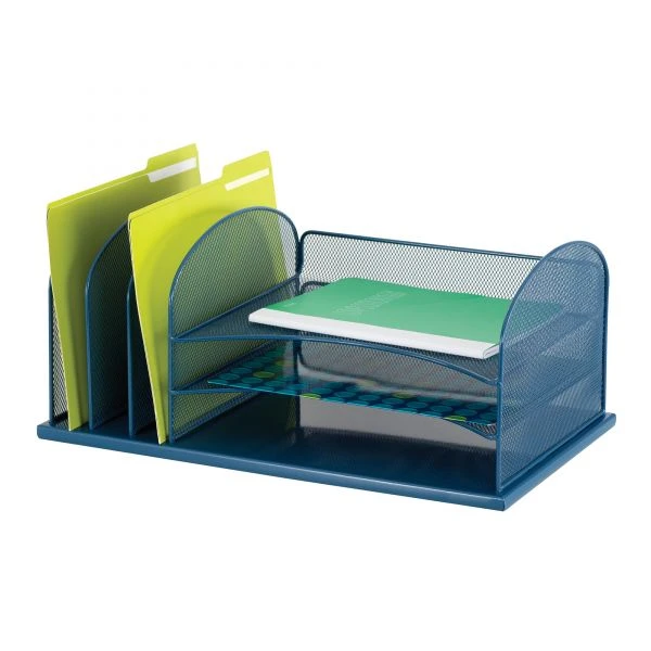 Safco Onyx™ 3 Horizontal/3 Upright sections – The Onyx™ wire mesh desktop organizer features 3 horizontal letter-sized trays and three 2″ wide, upright file sections on the left. The durable steel mesh design aids in office supply organization and file storage.