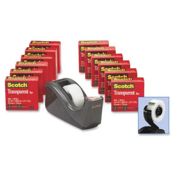 Scotch Transparent Tape Value Pack with Black Dispenser, 1″ Core, 0.75″ x 83.33 ft, Transparent – Scotch Transparent Office Tape is a glossy tape with a high-clarity finish. Instant adhesion delivers excellent holding power. Long-aging, moisture-resistant, stain-resistant tape is clear when applied and does not yellow. Tape pulls off the roll smoothly and cuts easily. Ideal for multipurpose sealing, label protection, general purpose wrapping and mending. Photo-safe tape comes in a wave-design dispenser with a no-lose attached tape hub. Dispenser is refillable.