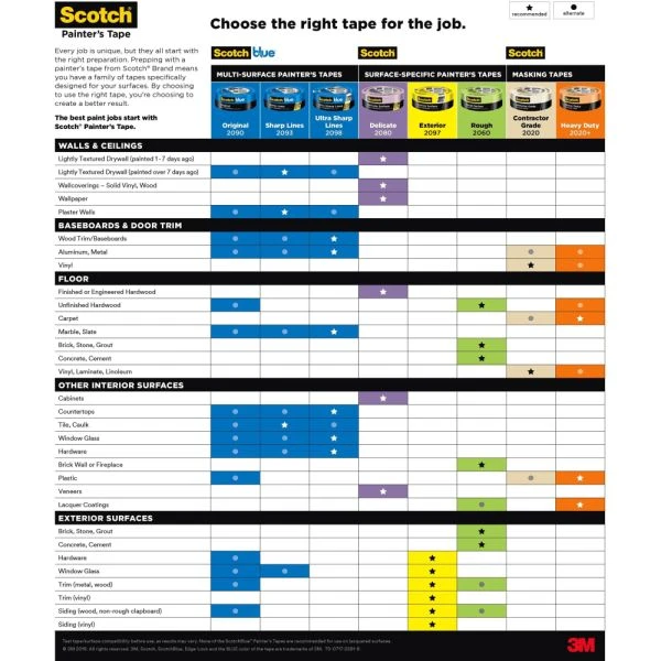 ScotchBlue Original Multi-Surface Painter’s Tape, 3″ Core, 0.94″ x 60 yds, Blue, 6/Pack – ScotchBlueâ„¢ Painter’s Tape is among the top selling painter’s tape in the U.S. for a reason—it’s the original blue tape that both pros and DIY painters have loved for more than 25 years. It can be used on a variety of surfaces: walls, trim, glass and metal, and it removes cleanly for up to 14 days and will not cause surface damage within that period, even if it’s exposed to direct sunlight.