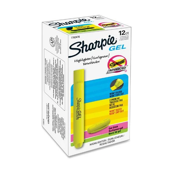 Sharpie Gel Highlighters, Fluorescent Yellow Ink, Bullet Tip, Yellow Barrel – Sharpie Accent Gel Highlighters feature new SmearBlock gel stick technology that provides total smear protection across pen, marker and inkjet printouts. Smear-protection includes ballpoint, roller and gel pens. Gel ink will not bleed through papers and won’t dry out if left uncapped. Sharpie Gel technology will last as long as a traditional pen-style highlighter: twist the bottom to advance the gel stick. The gel stick conforms to your handwriting style, making it perfect for highlighting, writing, doodling or drawing. Highlighter works on all paper surfaces including glossy, thin papers, Bible pages, and vellum papers.