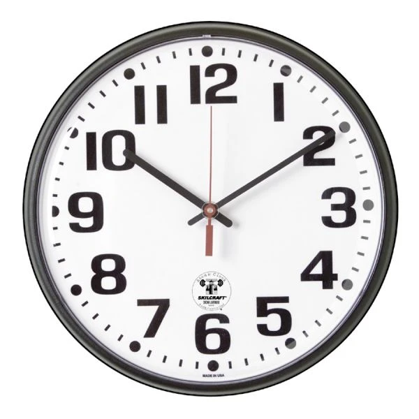Skilcraft Atomic Slimline Wall Clock – Slimline, radio-controlled atomic wall clock features quartz-movement that keeps accurate time to within one second of deviation every 30 million years and automatically changes for Daylight Savings and back in the fall. Design features a plastic case, white face, easy-to-read black Arabic numbers, black minute and hour hands and a red second hand. Wall clock uses one AA battery (not included) and includes hanging hardware. Plastic case is made a percentage of post-consumer material and will biodegrade within 2 years in landfills.