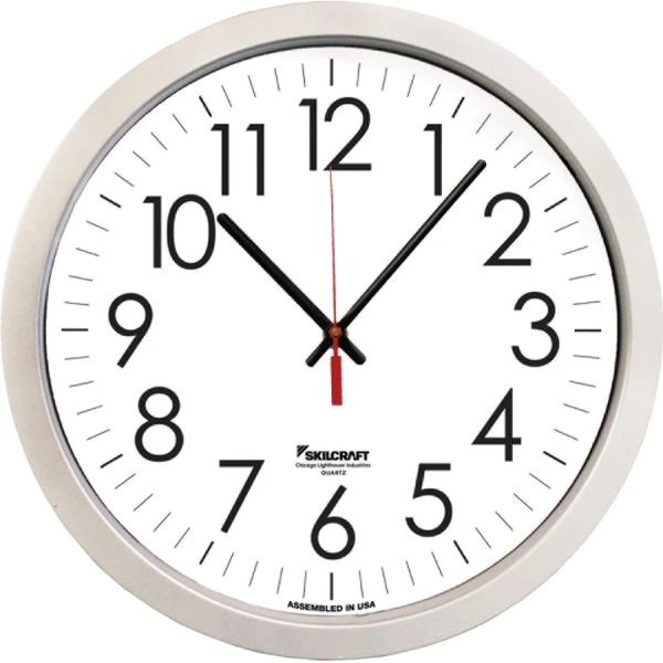 SKILCRAFT Silver Contemporary Wall Clock – Silver Contemporary Wall Clock clearly displays dependable time with battery-operated, Quartz movement and UV coating on the shatter-resistant, clear lens to prevent fading. Design features black Arabic numerals, minute marks, hour and minute hands as well as a red second hand. They are accurate to within 2 minutes per year. TAA-compliant wall clock has a 14.5″ diameter and silver case with white face. High-impact plastic frame and body are made with 30 percent post-consumer recycled content. Clock uses one AA battery (not included).