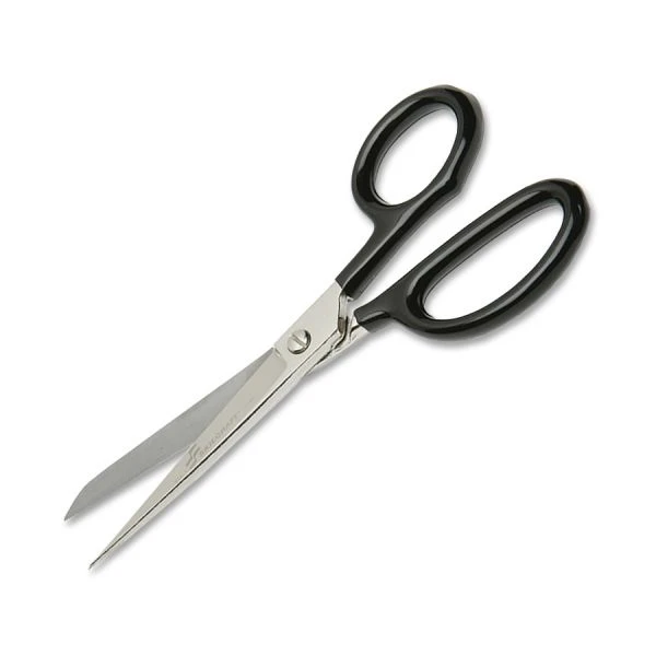 SKILCRAFT Straight Shears – Heavy-duty shears are ideal for cutting fine to heavy fabrics, cording, plastics, rubber, leather, vinyl and tape. Shears are intended for heavier applications, such as upholstery or on production lines where longer cuts and greater strength are needed. The shears have straight, black plastisol handles and polished, nickel-chrome-plated, drop-forged steel blades. One blade is pointed and has a thumb ring on the handle end, and the other is beveled. The cut length is 3″.