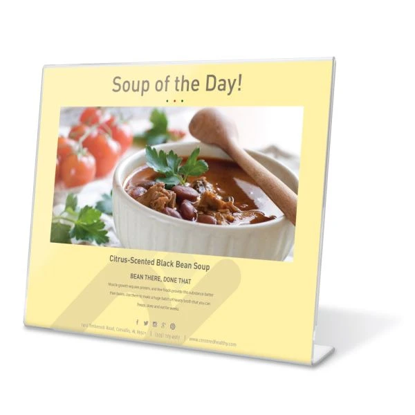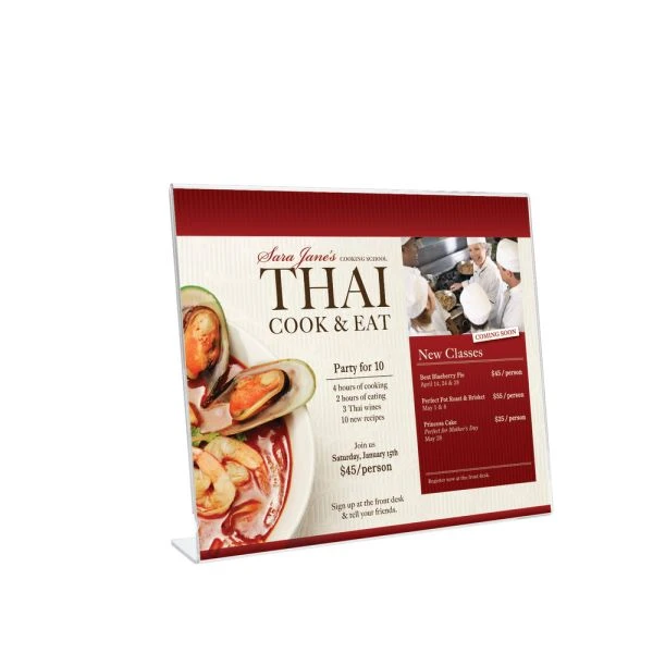 Slanted Sign Holder, Landscape/Horizontal, 8-1/2″H x 11″W, Clear – Freestanding L-shaped slanted signs are ideal for limited space