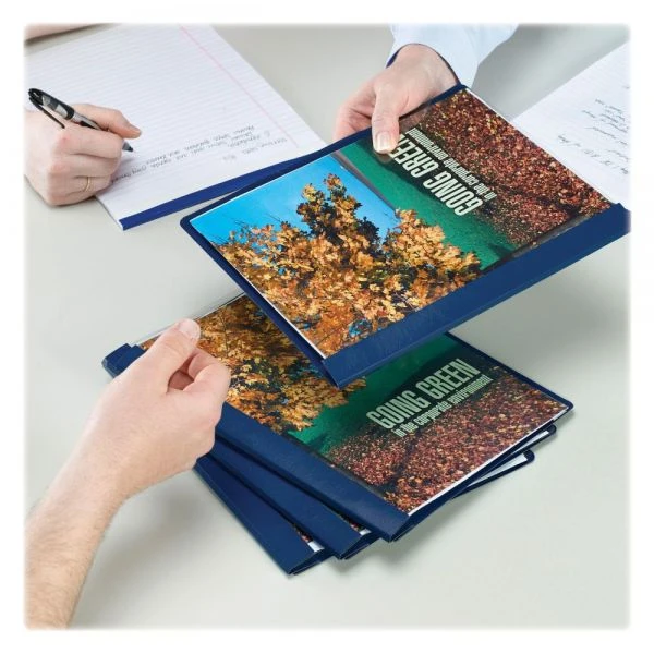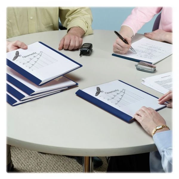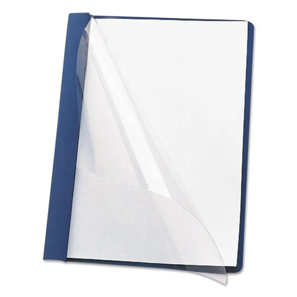 Smead Clear Front Report Cover, Double-Prong Fastener, 0.5″ Capacity, 8.5 x 11, Clear/Dark Blue, 25/Box – Let the front page or cover letter of your report or presentation show through in style with these attractive brief covers. A full-page, clear poly front attracts reader to your customized first page. Heavy-duty back panel is made of an embossed coated stock for durability. Secure letter-size documents with three 1/2 capacity, double-tang fasteners and metal eyelet binding holes. Fasteners are 4-1/4″ apart with 8-1/2″ outside centers for standard three-hole punch.”
