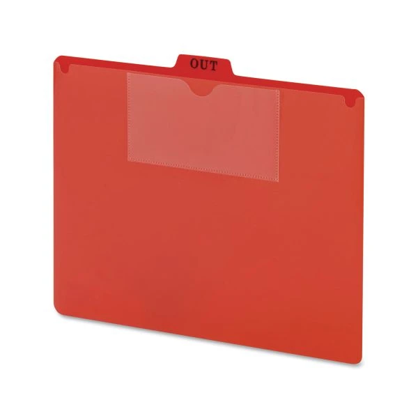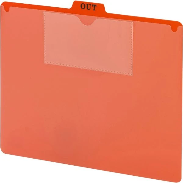 Smead Poly Out Guide, Two-Pocket Style, 1/5-Cut Top Tab, Out, 8.5 x 11, Red, 50/Box – Rigid, vinyl out guides with top tabs boldly mark where files have been removed. Large pocket temporarily holds full-size documents to be filed in the folder when it is returned. Small 5 wide x 3″ high pocket can hold a charge-out guide (not included). Translucent, nonglare vinyl pockets are welded to back panel. 1/2″ high tabs in 1/5 cut center position are embossed with the word “OUT.” Out guides are made of 15 vinyl stock.”
