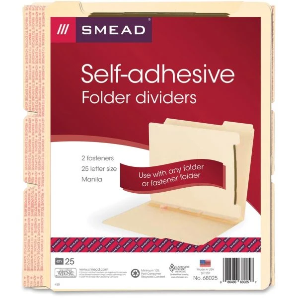 - Smead® 68025 and 68027 have a crimp-on fastener allowing papers to be attached to front and back of divider.
