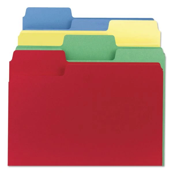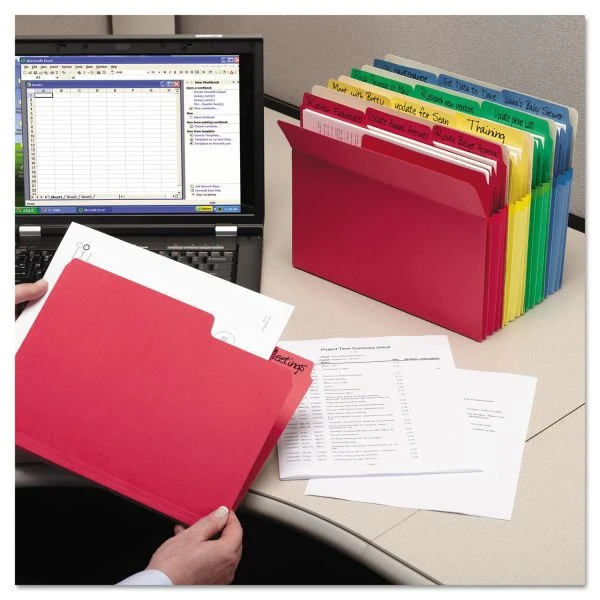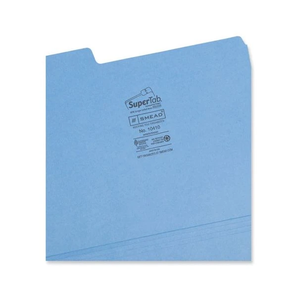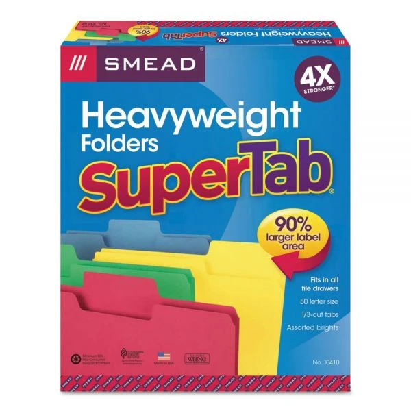 Smead SuperTab Colored File Folders, 1/3-Cut Tabs: Assorted, Letter Size, 0.75″ Expansion, 14-pt Stock, Assorted Colors, 50/Box – Use color to find critical files fast. Bright, vivid colors allow you to categorize your system in a variety of ways to significantly improve your filing and retrieval times. Compared to standard alternatives, SuperTab oversized tabs provide nearly double the labeling area, allowing you to clearly label your files, whether you choose to be more descriptive or simply choose to label larger. Though they feature tabs that are approximately 90% larger than average, their overall dimensions are very close to the norm, ensuring that these sturdy, durable folders fit neatly into any vertical or lateral filing system.