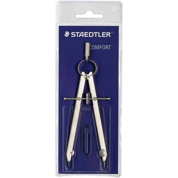 Staedtler Mars Comfort Compass – All-metal spring-bow compass feature a center wheel that delivers precision setting and prevents unintended setting adjustments. Maximum circle diameter is 10-3/8″ (265mm). Design features interchangeable lead part and a nickel finish to resist rust and stains. Compass includes a spare lead tube and comes in a plastic wallet.