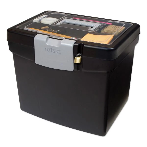 Storex Portable File Box with Large Organizer Lid, Letter Files, 13.25″ x 10.88″ x 11″, Black – The new Potable File Box from Storex has and extra large storage lid for all of your supplies. It holds 5% more hanging letter files and folders than our old box. It features a clamping latch which shuts the lid safely and, for added security, it also accepts a padlock.