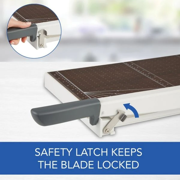 Swingline ClassicCut Guillotine Wood Trimmer – Create clean, professional cuts for your papers, photos and artwork with this ClassicCut Guillotine Trimmer. It has a solid wood surface and EdgeGlow LED lighting to help you achieve a clean, accurate cut every time. EdgeGlow LED light guide illuminates the edge of the trimmer to show exactly where cuts will be made. Solid wood surface is printed with alignment guides to help improve trimming accuracy. Guillotine blade has 12″ cutting length and cuts up to 10 sheets at once. Safety latch keeps blade in place when not in use. Trimmer includes three AAA batteries.