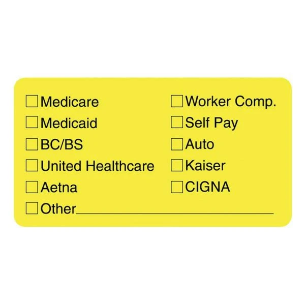 Tabbies Labels for Insurance List, 1-3/4 x 3-1/4, Yellow, 250/Roll – Labels to indicate insurance coverage provider are created for medical office use to convey vital information quickly and easily. The list with check-off boxes by each entry includes Medicare, Medicaid, Aetna, United Healthcare, BC/BS, workers comp, self-pay, auto, Kaiser or CIGNA. The label also has an entry marked, Other” with a line to write in another insurance provider.”