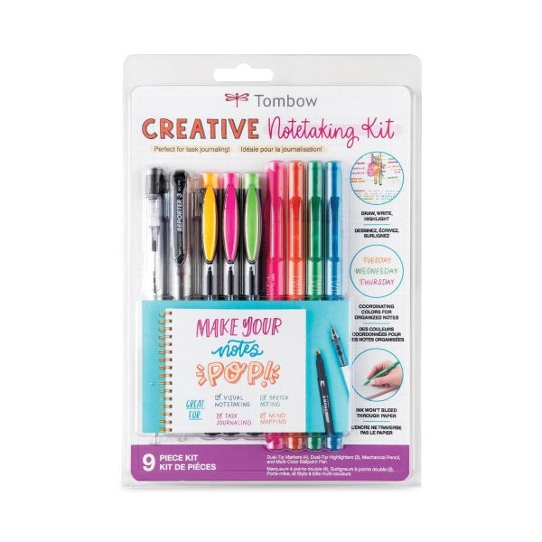 Tombow Creative Notetaking Kit, 0.7mm Ballpoint Pen, 0.5mm HB Pencil, (4) Bullet/Chisel Tip Markers,(3) Chisel/Fine Tip Highlighters – Tombow’s Creative Notetaking Kit takes your notes to the next level! Whether you’re writing traditional notes, sketch noting, mind mapping, or creating in your planner or journal, this kit has everything you need for bright colorful notes. Easily draw, write, and highlight with coordinating colors to keep your notes organized.
