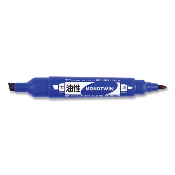 Tombow Mono Twin Bold Permanent Marker, Fine/Broad Tips, Blue, 10/Box – Permanent marker with two durable tips—wide chisel tip and fine bullet tip. Works on a wide range of materials, including paper, metal, plastic, glass, vinyl, porcelain, leather, and wood. Two tips provide options for making thin or thick marks of smear-proof oil-based permanent ink. Durable tips made of polyester fiber (chisel tip) and acrylic fiber (fine tip) stay fresh and firm even after heavy use. Great for marking on shipping labels, boxes, pallets, signs, and more. Anti-roll chisel tip cap prevents marker from rolling off work surface. Water resistant. 6 mm chisel tip and 2 mm fine tip.